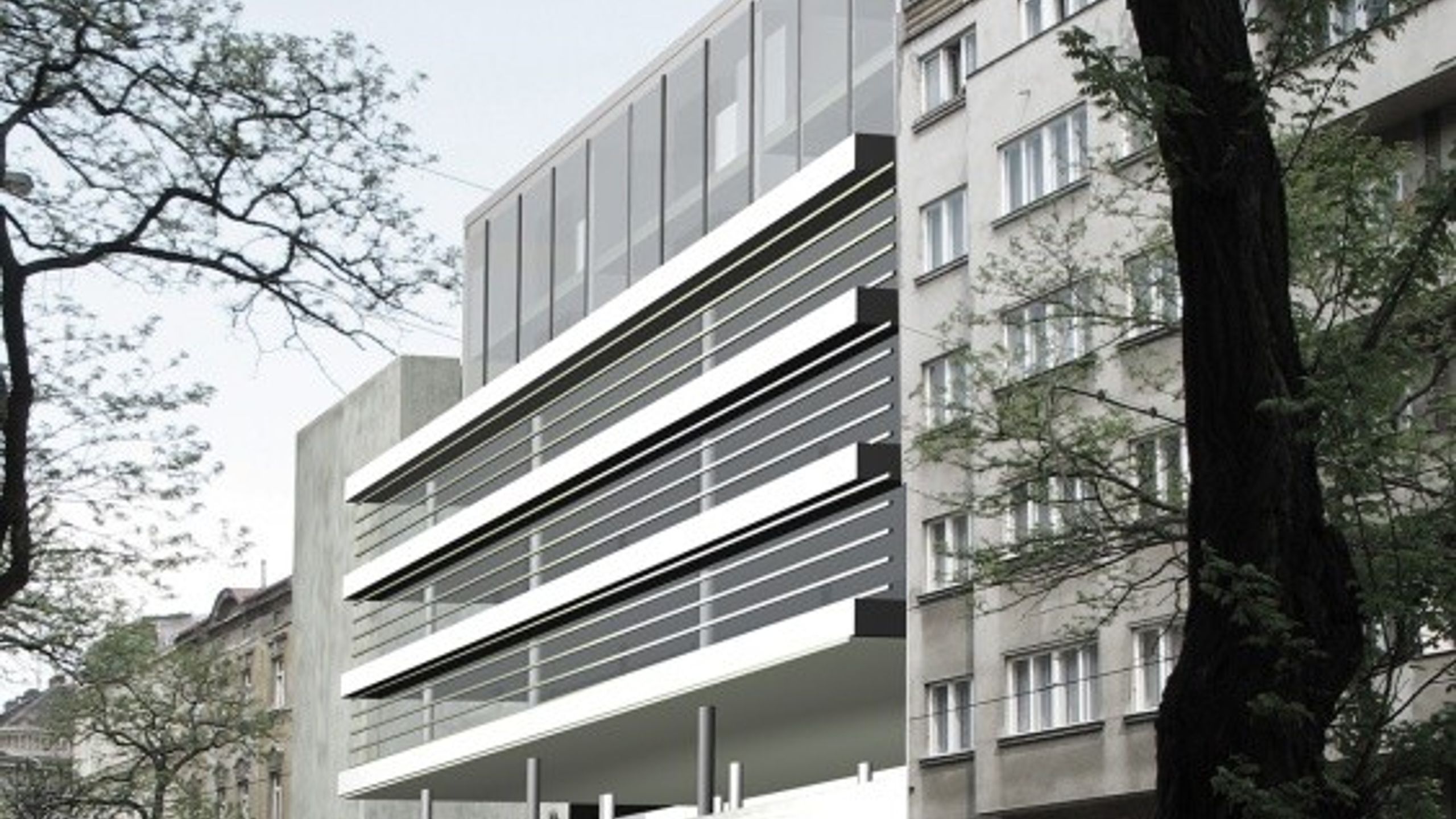 Kanceláře a bytový dům mají společné podzemní garáže sahající přes tři podlaží. Hmota 1.a 2.np se vine kolem vnitřního atria a je ukončena veřejnou terasou. Na ní jsou nasazena tři podlaží kanceláří se zvýrazněným horizontálním členěním desek, které dále obíhají směrem do atria a přecházejí v desky pavlačí bytového domu. Na objekt kanceláří navazují obytné ateliéry. Bytový dům je rozvolněn nástavbou mezonetů.