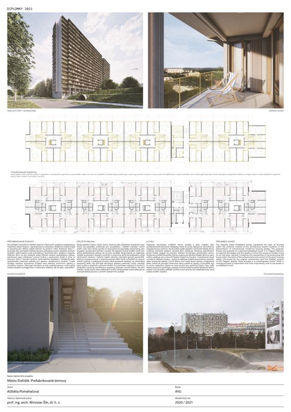Diplomová práce Prefabrikované domovy reprezentuje téma bydlení v rámci společného zájmu studentů Školy architektury – fenoménu československých modernistických sídlišť. Návrh na příkladu vybraného panelového domu T1 v pražských Bohnicích zkoumá míru a kvalitu, ve které se podařilo uskutečnit utopii minimálního obytného standardu pro všechny bez rozdílu. Práce hledá možnosti rekonstrukce domu v mantinelech kulturně sociálního kontextu sídliště, v možnostech dané konstrukce, i v širších souvislostech pražského panoramatu.