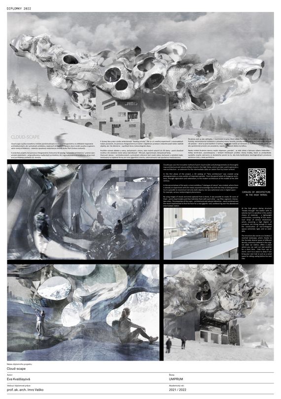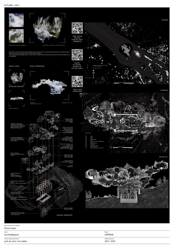 S dôrazom na vzájomné prepletenie virtuálneho s hmatateľným je cieľom práce overiť metódy videnia skrz 3D skener,fotogrametriu a film v kontexte, prepájajúcom prírodu, klímu a architektúru a na základe kritickej tézy tieto postupy použiť pre re-imagináciu vysokohorskej krajiny prostredníctvom mračien bodov ako médiom pre vizualizovanie a testovanie nových priestorových konfigurácií architektonicky charakteristických prvkov Vysokých Tatier – ich preusporadúvaním a rozvíjaním do nových foriem a ponúknuť nepreskúmané možnosti scenárov vývoja skalnatého horského prostredia. V praktickej časti diplomovej práce bola ako miesto testovania navrhovacích metód prostredníctvom fotogrametrie a point cloudov zvolená medzistanica lanovej dráhy Štart od architekta Dušana Jurkoviča.