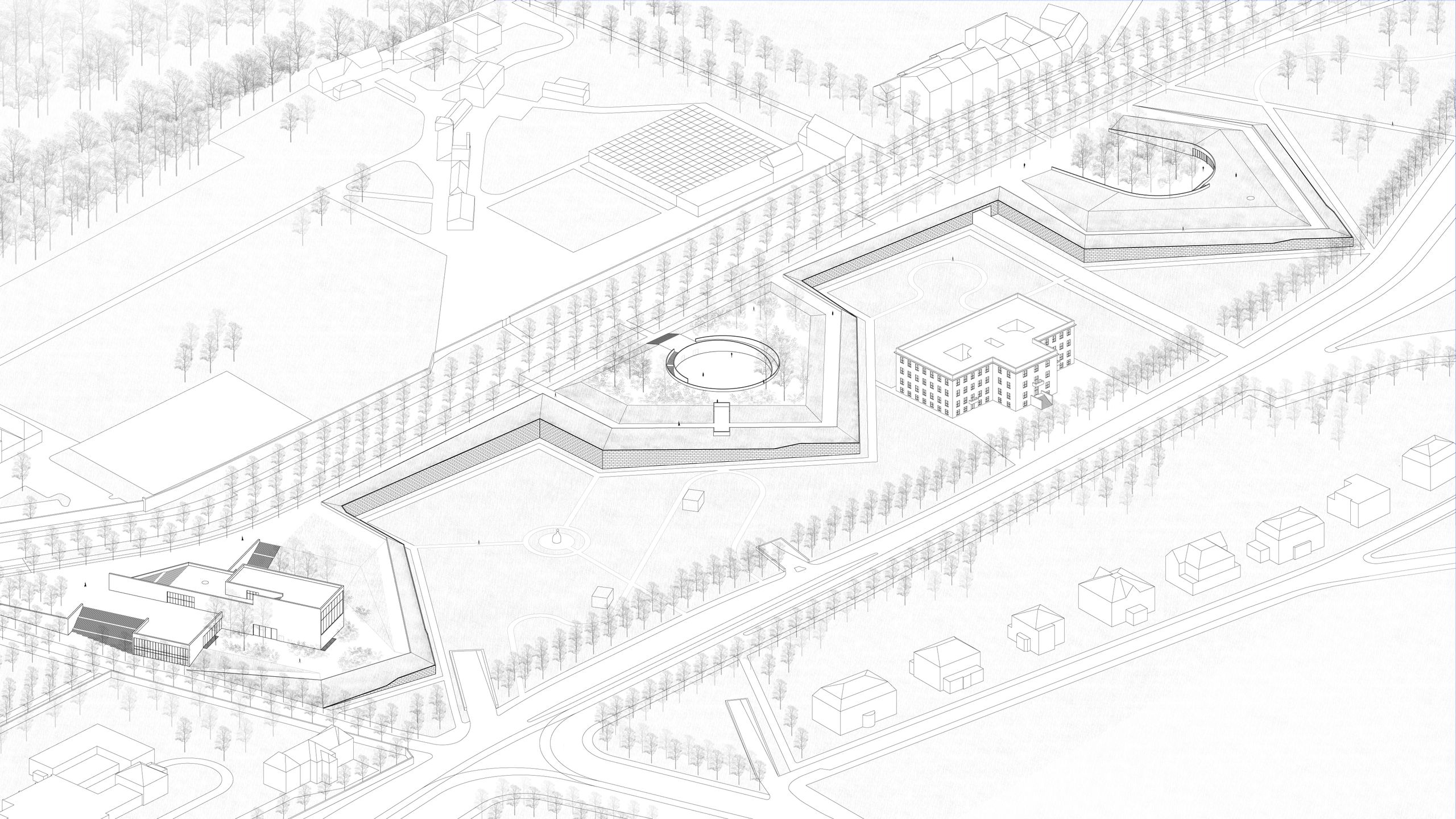 Projekt vychází ze zkoumání okružních linií a jejich vztahu k městu. Toto bádání mě dovedlo k pozůstatkům pražských barokních hradeb, jejichž část ve své práci rehabilituji a tím zpřístupňuji zpustošenou trojici bastinů sv. Václava, sv. Benedikta a Panny Marie. Na nich navrhuji park a galerii. Ta je fragmentována na tři části, které umísťuji do zachovaných zemních náspů. Tím katalizuji o dnes aktivity chudou ulici Jelení, která obchází severní stranu Pražského hradu. V širším městském měřítku zalátávám děravé místo mezi Letenskou plání a Strahovem, ale také mezi Dejvicemi a Pražským hradem.