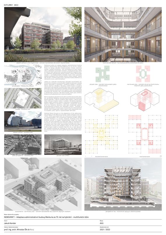 Diplomová práce se zabývá adaptací administrativní budovy podniku zahraničního obchodu Merkuria ze 70. let 20. století. Práce se věnuje aktuálně diskutovanému tématu demolice staveb z období brutalismu. Tato architektura je často spojována s tehdejším politickým režimem v Československu, který ve značné části společnosti vyvolává především negativní pocity. Unáhlené odstraňování těchto staveb a jejich nahrazování novými, z architektonického hlediska často velmi spornými objekty, postupně stírá stavební kulturu tohoto období. Stejně tak má být v blízké budoucnosti zbourána budova Merkuria a nahrazena novou „administračkou“.