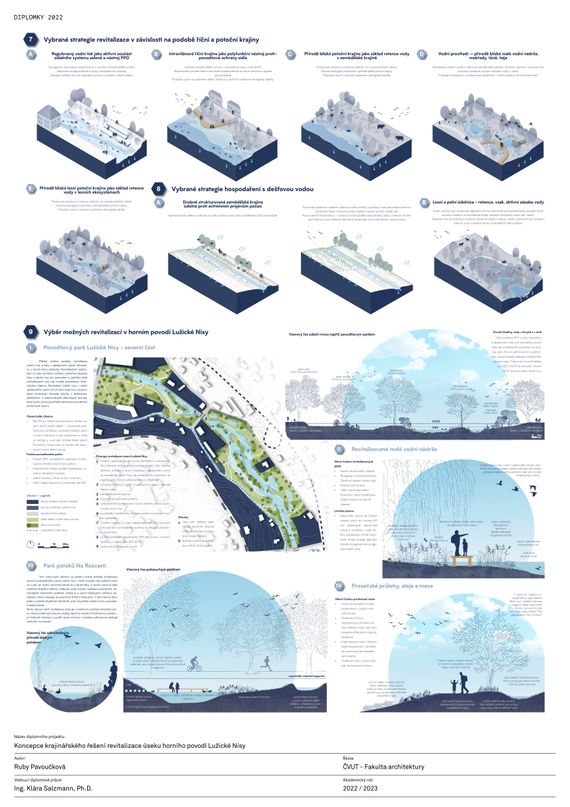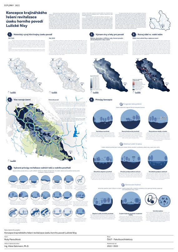 Diplomová práce se zabývá koncepcí revitalizace prostoru vybraného dílčího povodí Lužické Nisy, který se nachází v horní části jejího povodí. Vybraný prostor leží mezi hustě zastavěným Libercem a Jabloncem a má vysoké povodňové riziko. Přes obecnou analýzu přírodních podmínek celého horního povodí a analýzu proměn kulturní krajiny údolí Lužické Nisy od pramene po Liberec se práce dostává ke zmapování současného stavu vodních toků a navazující kulturní krajiny. Na základě této analýzy je dále vytvořena koncepce krajinářského řešení revitalizace této krajiny. Koncepce je strukturována od zastřešující vize, cílů a principů rozvoje povodí, přes strategie a nástroje revitalizace vodních toků, vodního prostředí a revitalizace retenčních schopností příměstské zemědělské krajiny až po příklady ideových revitalizací vybraných částí říční a potoční krajiny a navazující zemědělské krajiny.