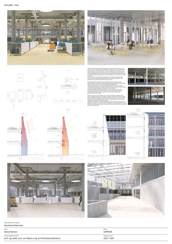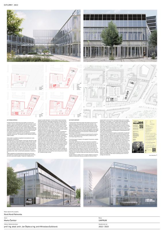 Projekt Nová Palmovka se zaměřuje na adaptaci objektu Nová Palmovka v pražské Libni. Vytvořil jsem zadání této adaptace pomocí participativního plánování. Kvantitativní metodou dotazníků, která se zaměřovala na otázky občanské vybavenosti, odhalila významnou poptávku po komerčních a kulturních službách. Absence těchto služeb je výsledkem dlouhodobě nekoncepčního rozvoje této lokality. I Nová Palmovka může spadat do tohoto trendu. V současnosti se připravují koncepční studie na úpravu tohoto objektu na sídlo Evropské kosmické agentury (EUSPA). Je důležité, aby evropské instituce existovaly napříč zeměmi EU, avšak Nová Palmovka je příliš významná na to, aby se stala izolovaným titánem v novém urbanistickém rozvoji celé lokality. Samotná existence tohoto projektu svědčí o aroganci veřejné moci a neochotě našich „zástupců“ podílet se na veřejném zájmu. Přenechání celého objektu EUSPA, přes veškerou prestiž a vznešené poslání, by bylo stejným gestem. Další část Libně by byla vytržena z mapy, stejně jako mnoho jiných. Proto se prostřednictvím tohoto projektu snažím vyzvat k nalezení symbiózy mezi státními zájmy a potřebami místních. Věřím, že syntézou těchto zájmů je možné nalézt nová řešení, která mohou prospět všem.