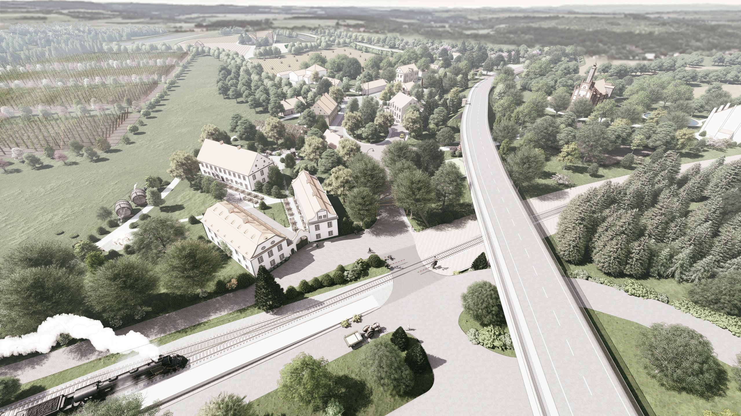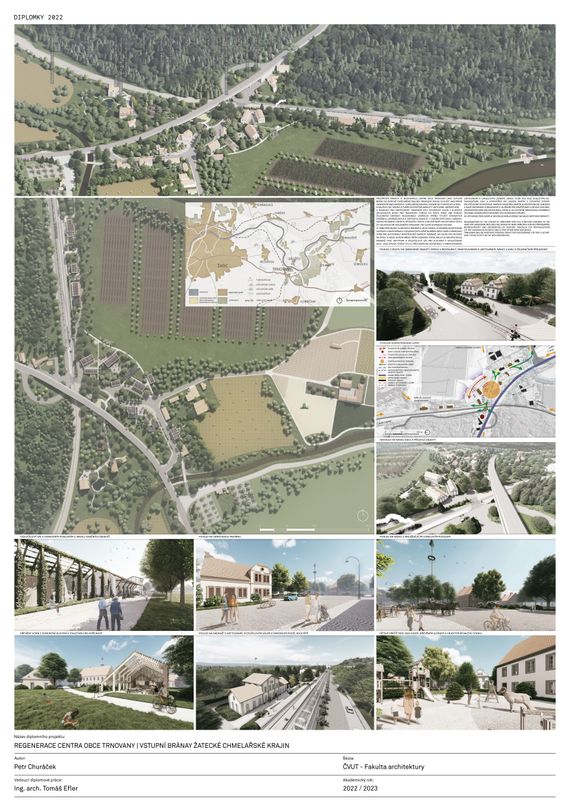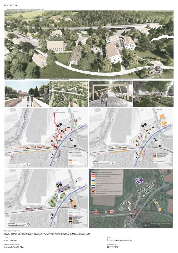 Diplomová práce zpracovává území obce Trnovany u města Žatce jako částečně urbanistický projekt s podrobnějším detailem jednotlivých objektů. Předmětem návrhu je regenerace centra obce Trnovany jako vstupní brány do Žatecké chmelařské krajiny. Trnovany budou sloužit jako první orientační bod návštěvy chmelařské krajiny, uvedení do turistických tras a dalších cílů. Návrh vytváří dostatečné kapacity ubytování, občerstvení a rekreace pro návštěvníky. Trnovany byly historicky jeden z hlavních spojovacích bodů pro transport chmele do žatce, mimo jiné pomocí železniční dopravy. Regenerace zahrnuje změnu využití stávajících drážních, zemědělských a obytných objektů v chátrajícím stavu, obnovu nedochovaného objektu bývalého statku a novostavby kolem návsi spolu se souvisejícími krajinnými úpravami. Pro lepší dopravní spojení je obnoven objekt vlakového nádraží a jeho funkce, doplněna novostavba zastávky lodní dopravy v severní části území na břehu řeky Ohře a parkovací stání pro automobily návštěvníků naproti nádraží, na ploše pod mostem na žatec a podél levého břehu říčky Blšanka. Podél kolejí se nachází vedle nádraží také ubytovna a víceúčelový sál pro kulturní a společenské akce. Dále bývalý statek čp.2 je přestavěn na restauraci s minipivovarem, ubytováním a chmelovými lázněmi. Náves tvoří osa mezi důležitými komunikačními uzly a uprostřed má usazen parčík s vysokými stromy pro příjemný odpočinek. Naproti sobě přes parčík je návštěvnické centrum s další občanskou vybaveností a službami pro návštěvníky a bývalý hostinec zrekonstruován jako restaurace, která je se sousední obnovenou pekárnou spojena venkovním posezením pod korunami stromů. Ve východní části území je revitalizován hostinec na další ubytovací kapacity.