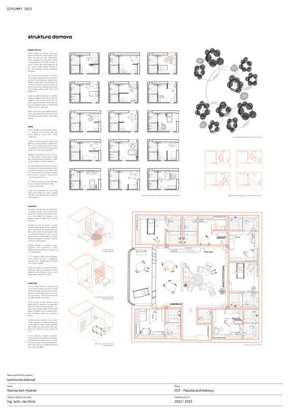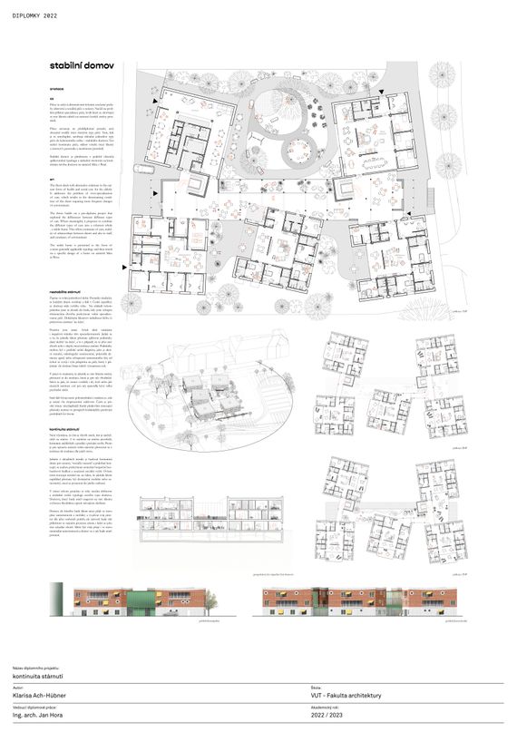 Práce navazuje na předdiplomní projekt, jenž zkoumal rozdíly mezi různými typy péče. Tam, kde je to smysluplné, navrhuje skloubit jednotlivé typy péče do koherentního celku – stabilního domova. Ten nabízí kontinuitu péče, stálost vztahů mezi klienty a zároveň k personálu a neměnnost prostředí.
