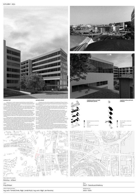 Při hledání vhodného doplnění narušené struktury jsem zkoumal možnosti a příklady komunitních center společně s různými formami křížení v rámci měst. Tématika úzce navazovala na potřeby nejen Smíchova, ale i konkrétní lokality, kterou jsem se v práci snažil zapojit do širšího fungování čtvrti. Cílem zároveň bylo vytvořit protipól nedaleko vznikající zástavbě, která svým charakterem opomíná potřeby běžných obyvatel Smíchova.