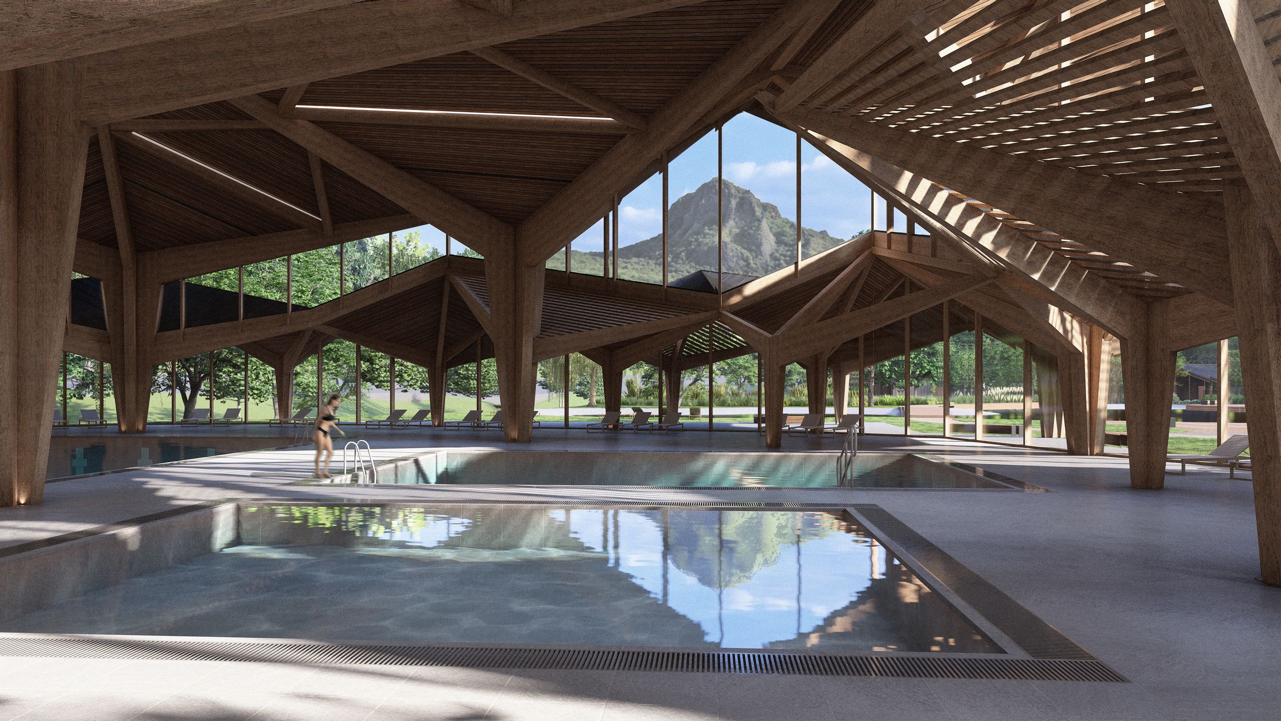 Bazénový komplex s wellness centrem na periferii Bíliny se snaží svou výraznou formou zaujmout turisty z dalekého okolí. Stavba bude charakteristická sloupovím evokujícím kmeny stromů, které ponesou dynamicky členitou střechu. Návštěvník si může tento tvar spojit buď s nepravidelným reliéfem tvořeným vrcholky korun stromů, nebo naopak s jejich spodní částí, která vytváří dojem přirozeného podloubí. Tento „les“ pak nabídne příjemné prostředí pro sport i odpočinek.