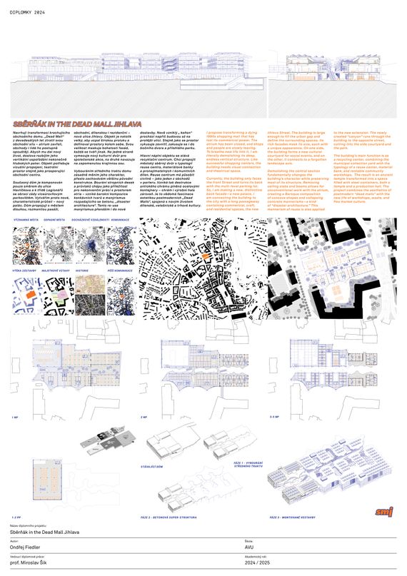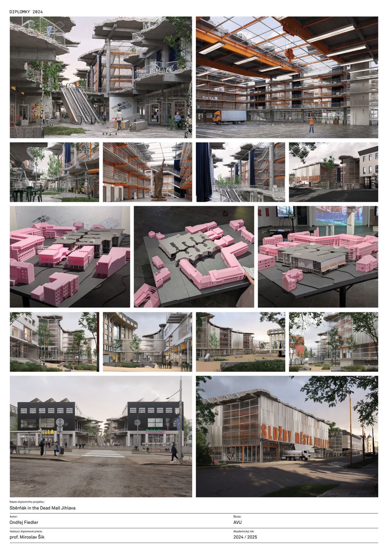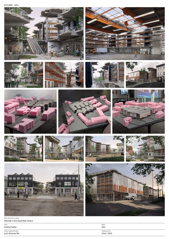 Hlavní náplní objektu se stává recyklační centrum. Chci propojit městský sběrný dvůr s typologií reuse centra, materiálové banky a pronajímatelných i komunitních dílen. Reuse centrum má působit civilně – jako jeden z obchodů v parteru. Vzniká tak destrukce antického chrámu plněná ocelovými kontejnery – chrám i výrobní hala zároveň. Je to vědomá fascinace estetikou postmoderních „Dead Malls“, spojená s novým životem dílenské, vetešnické a trhové kultury.