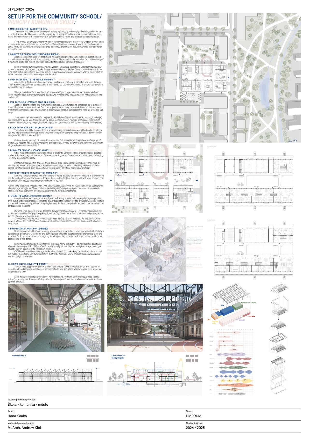 Deset principů komunitní školy, které vycházejí z teoretické části a jsou uplatněny v návrhu, se snaží předat dál vizi, kterou mohou využít zřizovatelé, ředitelé i uživatelé škol.