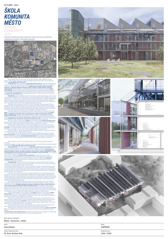 Praktická část práce se soustředí na návrh komunitní školy v areálu bývalé Pragy na Praze 9, kde má vzniknout nová městská čtvrť. Navrhuji školu umístit k hale 11, která je jedním z posledních objektů areálu.