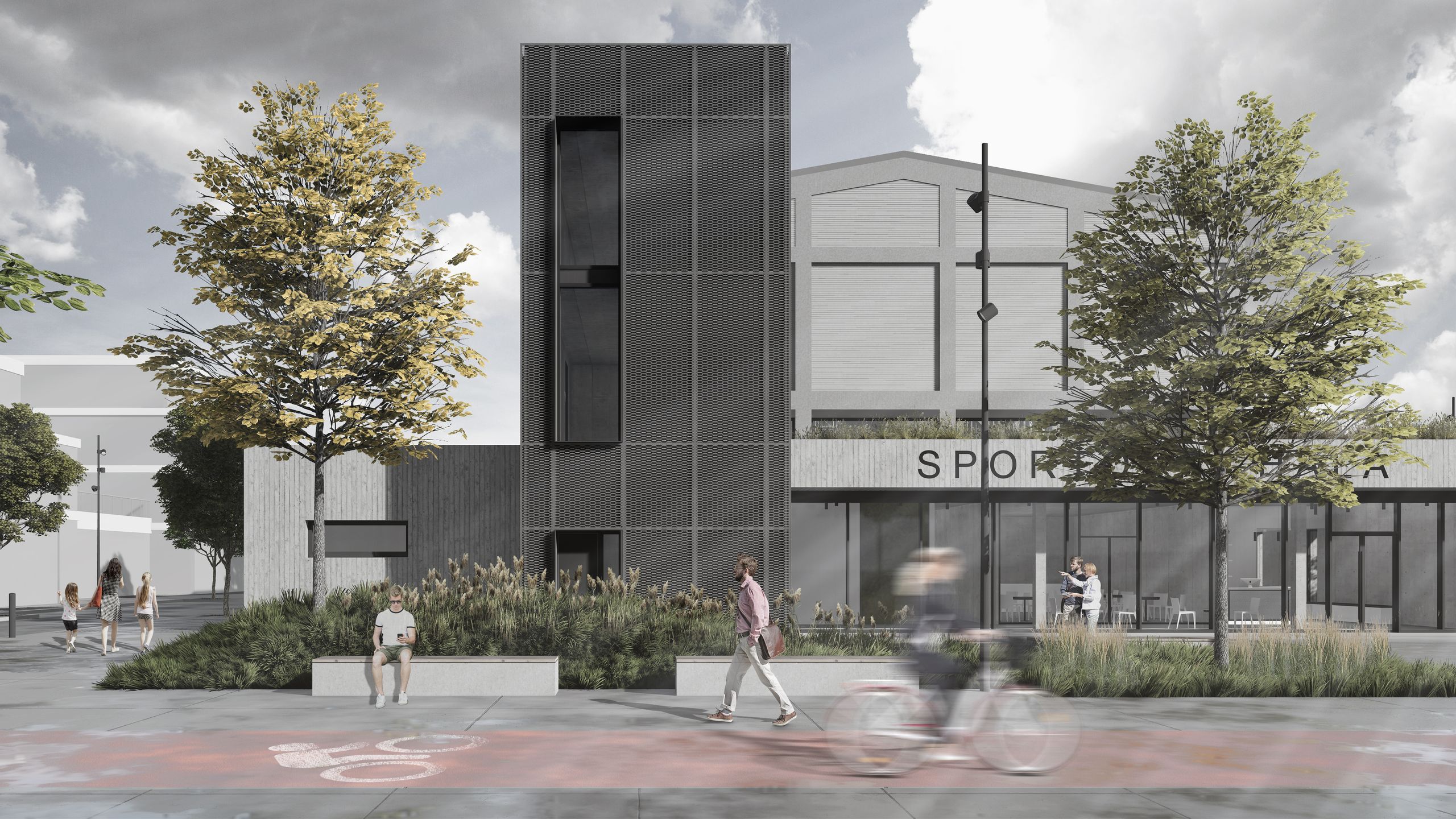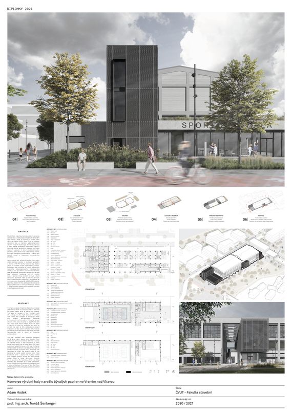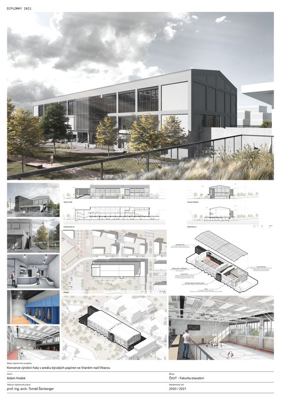 Předmětem tohoto projektu je návrh konverze výrobní haly v areálu bývalých papíren ve Vraném nad Vltavou. Areál se nachází v severní části obce, na pravém břehu Vltavy. Dnes je komplex výrobních hal a menších administrativních objektů veřejně nepřístupný, téměř nevyužívaný a zašlý. Zabírá významnou část břehu Vltavy a brání tak jejímu využívání a zapojení do života místních obyvatel. V rámci urbanistické koncepce došlo k návrhu nového urbanistického souboru, který řeší zmíněnou problematiku a nabízí obci možný rozvoj s nádechem industriálního prostředí. Řešený halový objekt byl původně navržen jako jeden velký otevřený prostor s vloženým podlažím v úrovni 2. NP. Při návrhu konverze byl kladen důraz na vhodné využití objemného prostoru. Podstatou této konverze je využití původního masivního železobetonového montovaného skeletu a jeho doplnění o nové konstrukce. Došlo také ke zjemnění původního měřítka tím, že hala byla viditelně rozdělena na tři funkční celky - sportovní halu, kulturní centrum a kryté parkování. Sportovní hala a kulturní centrum, jejichž hlavní prostory zaujímají 2. NP, vyžadují ke svému provozu dostatečně velké funkční zázemí. Zázemí je řešeno formou přístaveb, které doplnily původní kompozici o novou architekturu. Plocha 1. NP původního objektu byla využita k vytvoření krytých parkovacích stání. Provoz sportovní haly není navržen pro pořádání profesionálních sportovních soutěží, ale spíše pro amatérské a rekreační účely. Tomu také odpovídá navržené provozní schéma. Provoz kulturního centra je navržen jako multifunkční prostor, který zohledňuje kulturní potřeby obce Vrané nad Vltavou. Jeho variabilita umožňuje využívat prostory například pro promítání (kinosál), pro menší divadelní představení, pro obecní slavnosti (plesy, taneční zábavy) a také pro výstavní či galerijní účely. Tuto variabilitu umožňuje použití teleskopického mobilního hlediště.